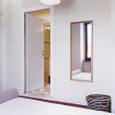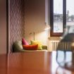 I colori vivaci come il viola, il celeste e il verde prendono ispirazione dagli anni ’70 rendendo tutti gli spazi del bilocale rilassanti e accoglienti. L’arioso appartamento si trova al terzo piano consentendo di ammirare lo splendore della città dall’alto.